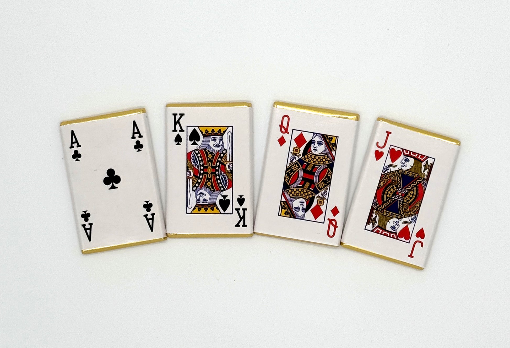 Chocolate Playing Cards by the Pound. Approximately 50 Milk Chocolate Assorted Playing Cards Per Pound. Ace, King, Queen and Jack. 1 1/2" wide x 2 1/4" long x 3/16 thick.